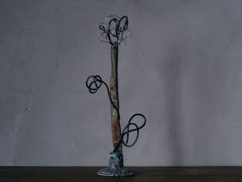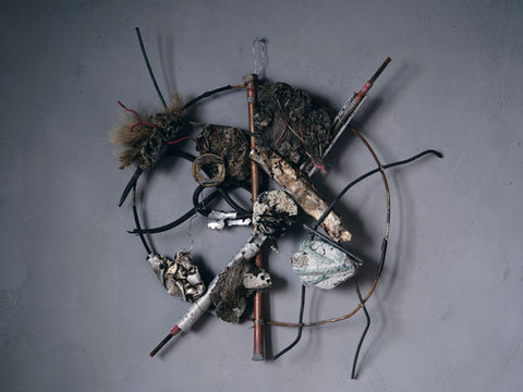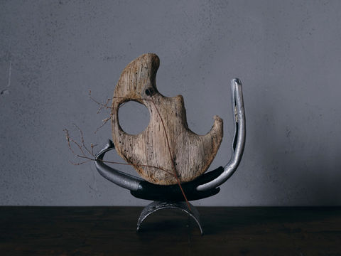 中野紀子の作品は、島に漂着するあらゆるものを材料とする。異国から流れ着いたシャワーヘッド、鋭さを失ったガラス片、大昔の漁具。自然の力によって無作為に削られた材料は中野の手によって拾われ、作品へと 昇華する。漂着物は、大昔からここに居たのだと言わんばかりの迫力に満ち、時を経て磨かれてきた品格さえ感じられる。世界の何処かに再び流れ着くことを欲するように作品達は静かに語り始める。